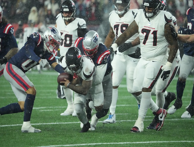 New England Patriots 3-4 nose tackle Khryis Tonga blitzed C.J. Stroud. Houston Texans right tackle Tytus Howard, who started at left guard against Pittsburgh last week got injured.