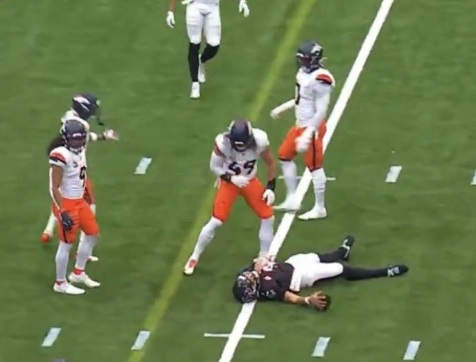 Chicago Bears backup 4-3 right end Austin Booker strip sacked Joe Flacco. Chicago Bears 4-3 defensive tackle Gervon Dexter recovered a fumble.