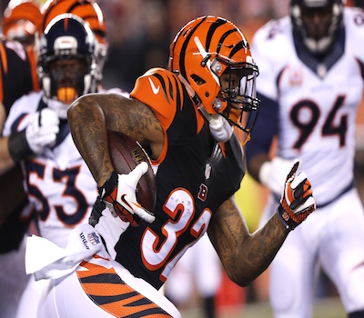 The Bengals get a great kickoff return as well, with Jones going 80 yards before finally being taken down. Dalton and the Bengals get backed up to third and eight, but Dalton responds with a short pass to Bernard for a touchdown. Bengals increase their lead 27-14. Manning is still without a touchdown in this game.