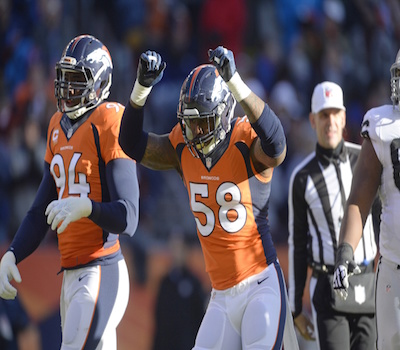 Denver won this with defense. DeMarcus Ware, Aqib Talib, and T.J. Ward played like the free agent signings that Denver paid big money for. Von Miller had a sack and dominated this game. Defensive tackles Terrance Knighton and Sylvester Williams clogged the running lanes and limited the Raiders to 67 rushing yards.