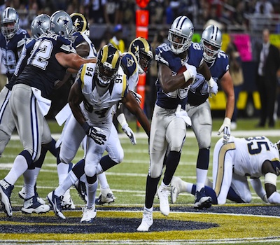 Romo threw a 68 yard touchdown to Dez Bryant in the 3rd quarter. Outside of the Bryant touchdown, Dez only tallied 21 total receiving yards through the air on 5 receptions. That big play gave Romo the confidence to deliver. The Rams led 21 to 20 after three quarters. After the Rams got a field goal, the Cowboys scored a touchdown giving them their first lead of the game up 27 to 24 in the fourth quarter. It looked like the Rams would regain the lead before Davis threw a pick 6 to Bruce Carter. Both Brandon Carr and Morris Claiborne did their job in coverage. Dallas took a 34 to 24 lead before winning 34 to 31.