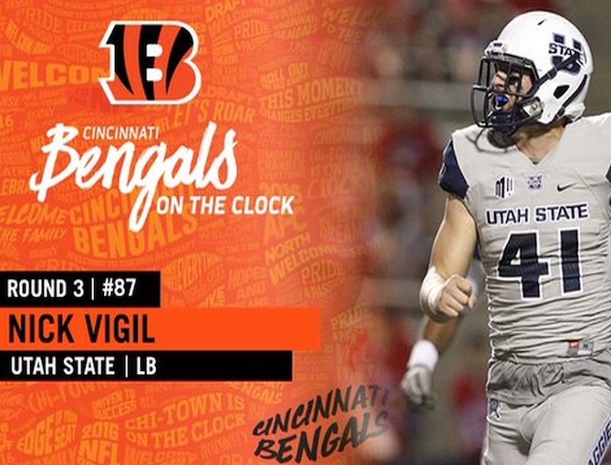 Nick Vigil is listed as a third string right outside linebacker. Vigil played middle linebacker at Utah State and I doubt he can make the transition to outside linebacker so I'm giving this pick an F grade.
