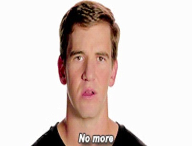 Eli Manning: I don't have the energy to say it 20 times. I said no more at least 13 times in the no more commercials plus 7 times to your face to that counts as 20 times. This meetings over. If I catch you beating another woman, Peyton and I are gonna cut your fucking arms off while Archie neuters you and sells your balls to Aaron Hernandez. Got it!