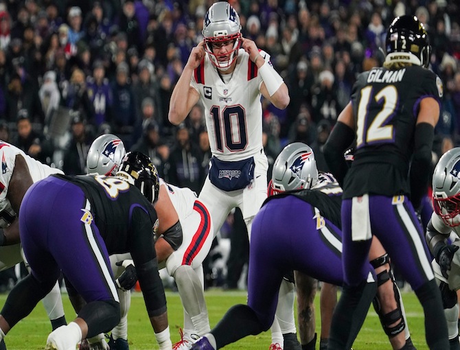 Drake Maye began this game 2/2 with 32 passing yards, 0 passing touchdowns, and 0 interceptions or incompletions. Drake Maye threw an incomplete pass. Baltimore Ravens boundary cornerback Marlon Humphrey intercepted Drake Maye.