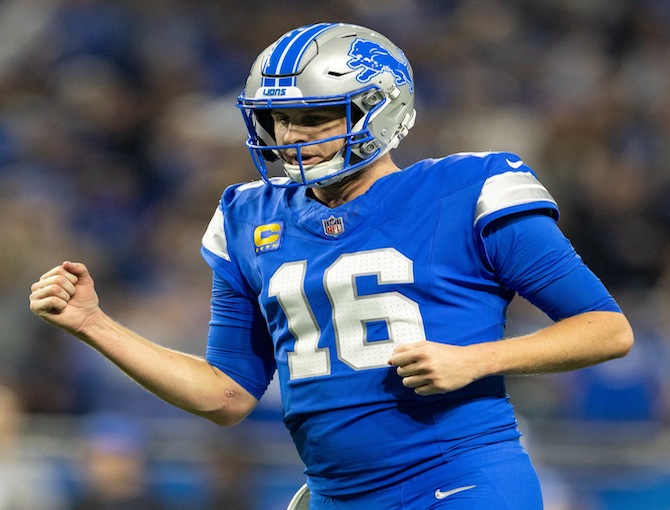 Detroit Lions quarterback Jared Goff threw a 8 yard touchdown pass to Detroit Lions tight end Brock Wright. Detroit led 21-7.