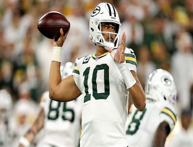 Green Bay Packers quarterback Jordan Love threw a touchdown pass to Green Bay Packers wide receiver Romeo Doubs. Green Bay led 7-0.