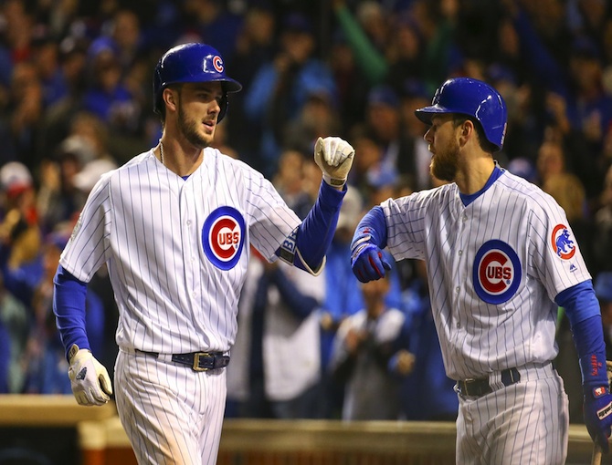 Kris Bryant stepped up to bat in the bottom of the fourth inning. Tevor Bauer pitched a ball to Kris Bryant on a 92-mile per hour fastball. Kris Bryant homered to tie the game a 1.
