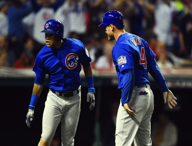 Josh Tomlin threw strike one to Kris Bryant. Then strike two. Kris Bryant gave the Cubs a 1-0 lead in the top of the first inning. Kris Bryant hit a 76-mile per hour curveball out of the park.